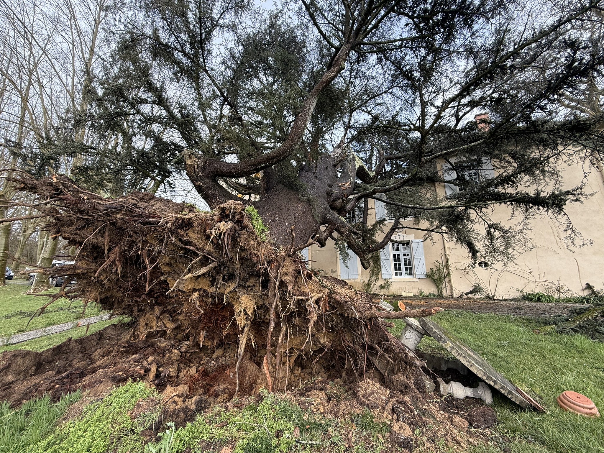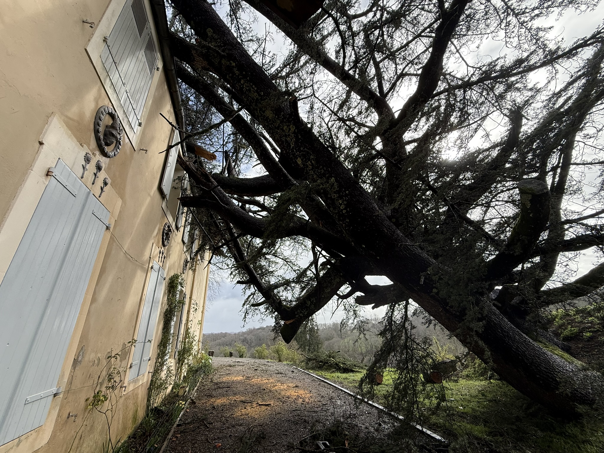 « Une branche courbe s’est accrochée au zinc d’une partie du toit. Cela a évité que toute la masse du cèdre éventre la toiture de tuiles. Les dégâts auraient pu être bien plus importants », apprécie Claire Desqueyroux. L’architecte, spécialisée dans la rénovation du patrimoine, est venue dès ce jeudi matin constater le sinistre.